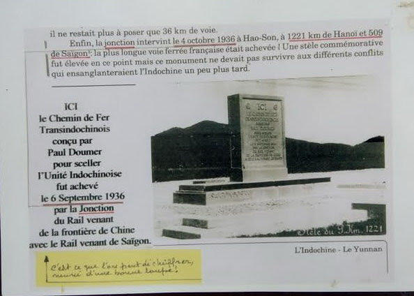 Trên bia khắc chữ Pháp, dịch sang tiếng Việt có nội dung: “Tại đây, tuyển đường sắt Xuyên Đông Dương, do Paul Doumer khởi xướng nhằm liên thông các xứ Đông Dương, được hoàn thành ngày 2 tháng 9 năm 1936 với sự kết nối đường ray đến từ biên giới Trung Quốc với tuyến đường ray đi ra từ Sài Gòn”. Phía dưới bia khắc hai dòng: Hà Nội 1221 km, Sài Gòn 509 km.