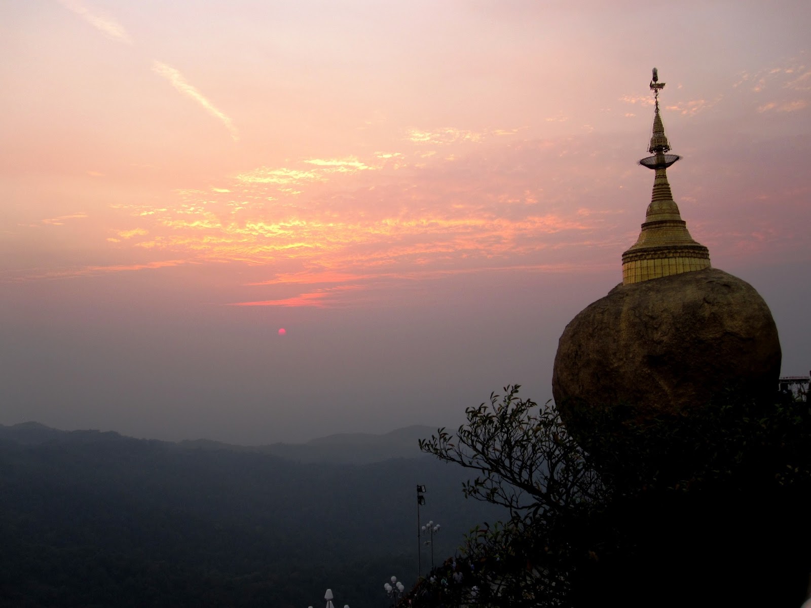 Một ngôi chùa khác được tín đồ Phật giáo khắp thế giới biết đến là chùa Kyaikhtiyo cách Yangon khoảng 200 km, nằm trên ngọn núi cao hơn 1.100m so với mực nước biển. Phật tử, du khách phải vượt qua đoạn đường dài đầy khó khăn để đến chùa. Nhiều người không thể hoặc không muốn leo núi nên mướn đội quân gánh thuê chuyên nghiệp từ bãi đỗ xe dưới chân núi. Đi chùa, có nhiều người bỏ tiền mua vàng lá dát vào đá không tiếc, nhưng họ trả giá với phu gánh võng từng đồng. Từ xa, có thể thấy “Tảng đá thiêng” (golden Rock) nằm chênh vênh bên mép núi, phần tiếp xúc bờ đất chỉ 78cm2. Phật tử có niềm tin rằng, do trên hòn đá có ngọn tháp giữ xá lợi tóc của đức Phật nên đủ sức mạnh thiêng liêng giữ hòn đá không rơi xuống vực. Bao nhiêu năm tháng đã qua, phật tử dành dụm tiền bạc mua vàng đến dát vào đá, và những năm tháng tới, họ sẽ tiếp tục làm như vậy. Người dát vàng và ôm hôn hòn đá với niềm tin sẽ được giàu có, thịnh vượng. Hòn đá chính vì thế mà cứ dày lên bởi các lớp vàng mà con người đem đến mặc cả với thánh thần.