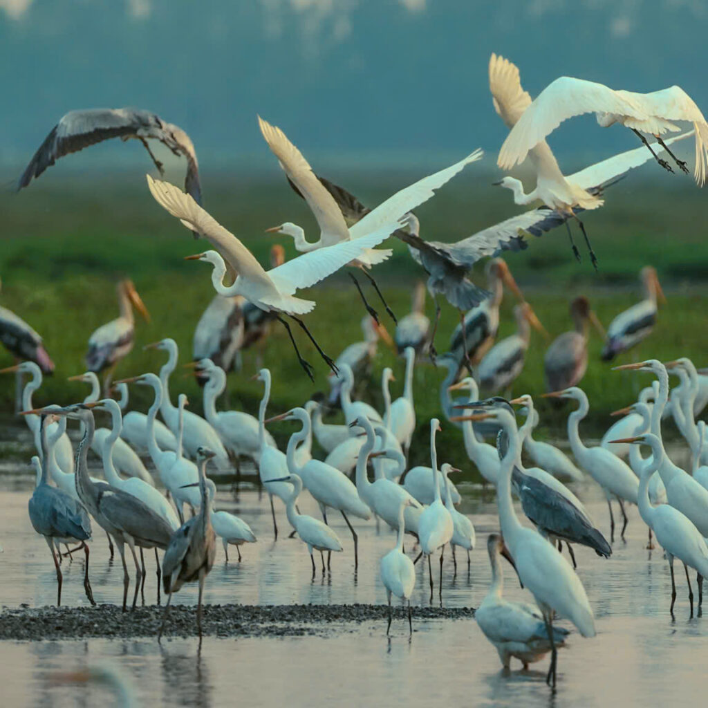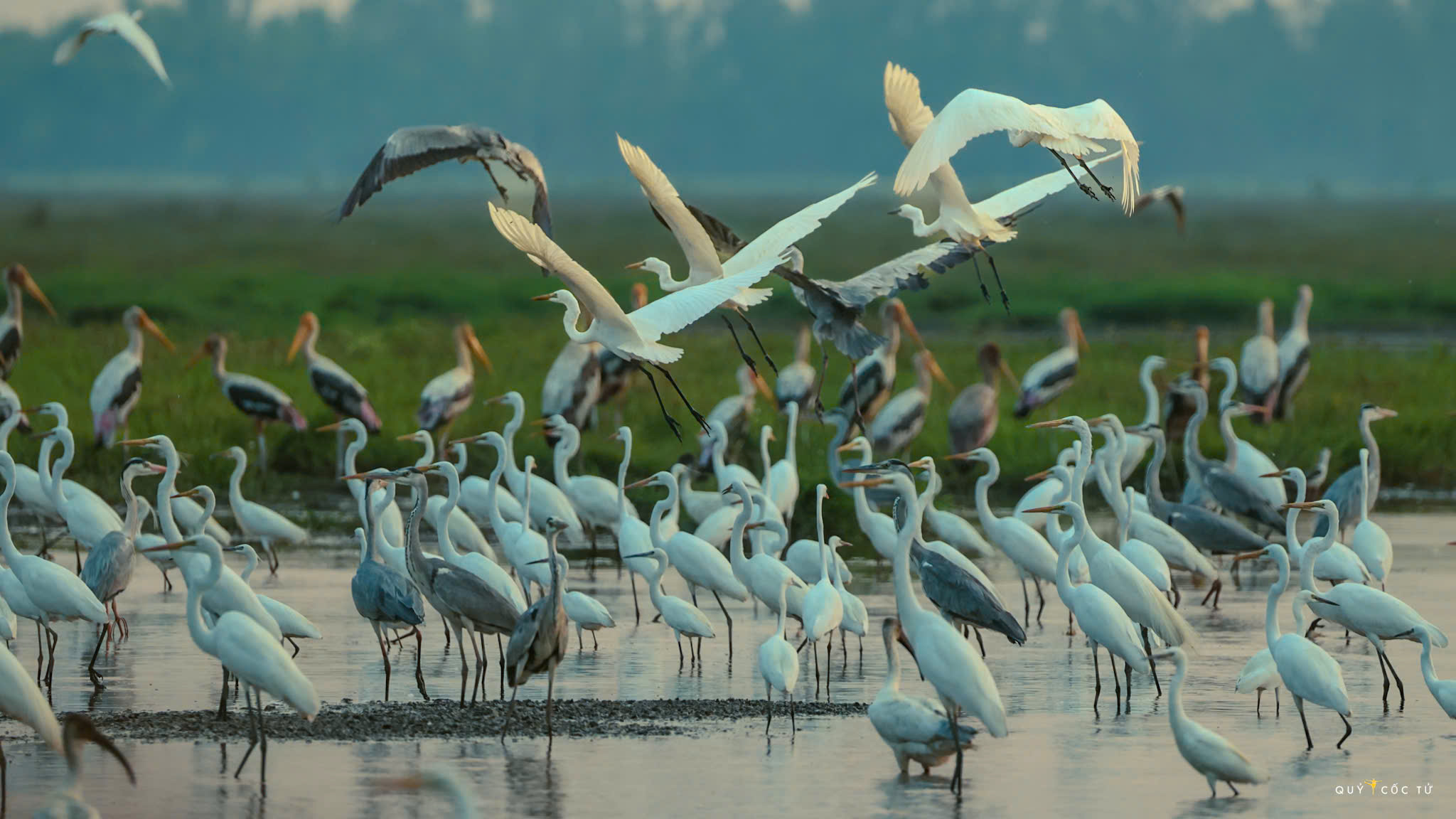 Thấp thoáng trong đó là dáng hình của những chú cò trắng thanh tao với bộ lông trắng muốt, xen kẽ là những chú diệc xám mang sắc tro trầm mặc, đầy oai vệ. Phía đằng xa là đàn cò ốc (cò nhạn) gây ấn tượng mạnh với màu lông đen – trắng tương phản, sải những nhịp cánh đầy uy lực trên bầu trời.