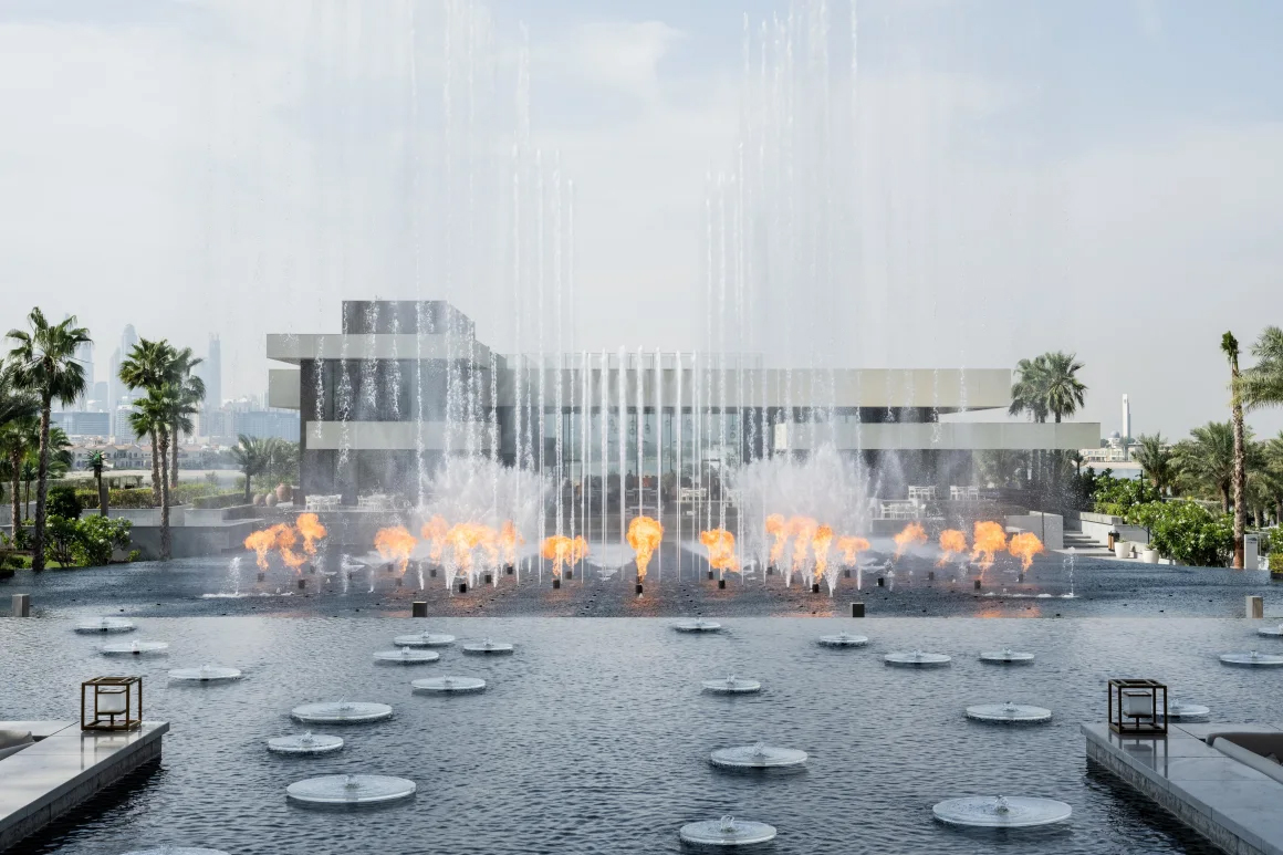 Đài phun nước Sky Blaze kết hợp 1.200 đèn với pháo hoa và hệ thống phun nước tại một khách sạn sang trọng.