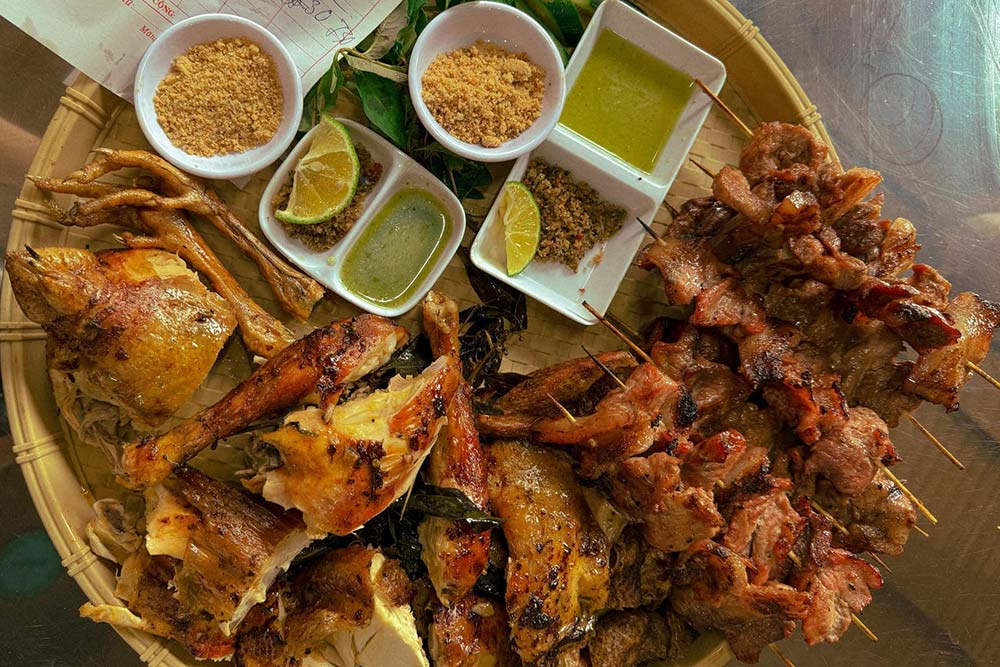Du lịch Buôn Ma Thuột, thực khách không thể bỏ qua món gà nướng trứ danh. Để làm món ăn này, đầu bếp lựa chọn những con gà thả vườn nặng chỉ khoảng hơn 1kg. Sau khi làm sạch, gà được tẩm ướp gia vị bí truyền, nước sả giã lọc và chút mật ong rừng, rồi nướng trên bếp than.